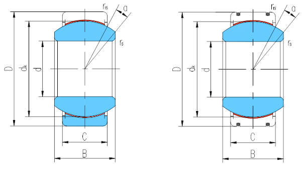 产品特点:外圈有一道轴向缝,两端带有密封圈,材料为轴承钢,淬火,磷化,球面粘贴PTFE编织物;内圈材料为轴承钢,淬火,球面镀硬铬。型号后置代号为XT,表示外圈沿轴向剖分成两半,用锁圈固定。